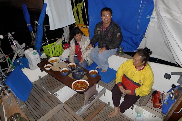 Všichni to ale ustáli. Jak jsme projeli vlnolamem, Janna se naposledy zhoupla a najednou se všem vrátila do líček barva, jeden přes druhého se začali prát o kormidlo, vinšny začaly cvrlikat. Foukalo asi deset uzlů, a přestože dalším bodem programu bylo vaření a Tchajwanci jsou vášnivými gurmány, zůstali jsme ještě asi dvě hodiny na vodě a křížem krážem jsme prošmejdili celý přístav. My jsme jenom seděli a rozdávali rozumy. Sem tam jsme pomohli s překříženým lanem na vinšně, nebo s vyproštěním lodě „ze želez“, když se našim hostům nepovedl obrat.