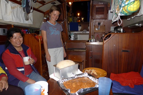 Tento týden jsme vlastně pekli celkem tři banánové buchty a tři chleby. Návštěv prostě bylo dost. Den na to přišel náš kamarád A-Čcheng z plachetnice Limei se ženou a maminkou, kteří nás po příjezdu do Sing-ta vzali do skvělé korejské restaurace v Tchaj-nanu. První padla buchta, pak, spolu s hlavním chodem, zmizela i půlka chleba. Mezitím se udělala další banánová buchta a další chléb, jejichž výrobu jsme slíbili během večeře ukázat.