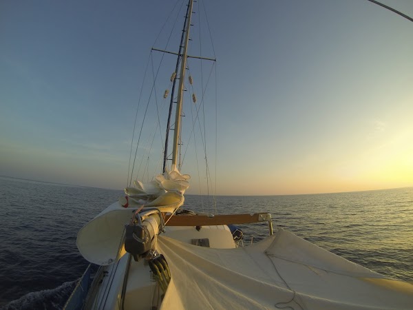 Blížil se čas večeře, a jelikož jsme žádnou rybu nechytli, Janička uvařila rajčatové rizoto, které stejně měla v plánu. Jak dovařila, chcípnul motor. Trochu jsme si povzdechli, ale jinak jsme byli v celku klidní, protože bylo jasné, že to je přívod paliva. Nejspíš se tam někde dostává vzduch. Ukázalo se, že těsnění prvního filtru se separátorem vody má blbý ó-kroužek, kolem kterého do hadičky proniká vzduch. Znovu jsme to sestavili a běželo to bez zaškytání až do teď. Janička spí, ale utichlý motor jí samozřejmě probudil. Nechal jsem jí dál spát a motor znovu pustil. Trochu zaškytal a pak se pěkně rozeběhl. Zdá se, že už se trochu zvedl vítr. Zatím nic moc, ale přeci jsem šel vytáhnout háčkovací genu, která nám přidala skoro půl uzle. Jestli motor opět chcípne, budeme pokračovat pod plachtami a filr zkusíme opravit za světla. Máme ještě jeden náhradní, sice bez skleněné vaničky, kde je dobře vidět profiltrovaný sajrajt, ale to není zas tak důležité.
