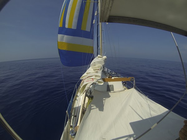 Včerejší noc proběhla klidně. Vítr pomalu slábl, ale dál jsme udžovali rychlost kolem 3 uzlů. Od rána začalo pražit, což jsme trochu podcenili a malinko se přismahli. Celý den foukal jen slabý vítr, ploužili jsme se, průměrně kolem 2 uzlů. Odpoledne opadl vítr úplně. Stále jsme se podle GPS pohybovali kolem 1 až 1,5 uzlů. Nějakou rychlost jsme očividně měli, protože kormidlo reagovalo, i když neochotně. Zbytek doplnil proud.